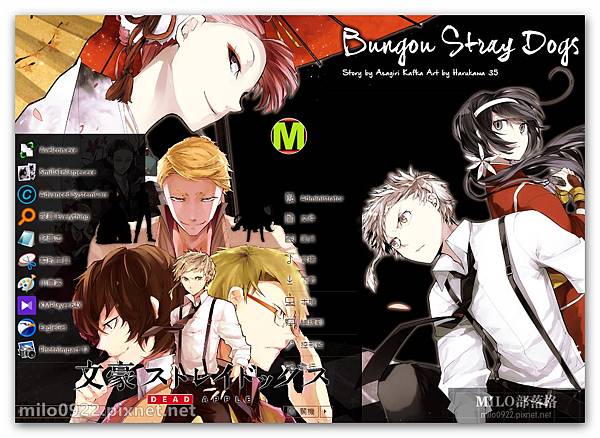 《 文豪野犬 》 Bungou Stray Dogs Win10 佈景主題THEME11 文豪Stray_Dogs 由朝霧卡夫卡擔當原作、春河35作畫的日本漫畫作品 ~中島敦恰巧撞見正在鶴見川「入水自殺」的武裝異能偵探社社員太宰治並把他救出、再一同解決「食人虎事件」後被推薦加入武裝異能偵探社。隨後陸續有港口黑幫成員試圖綁架敦............