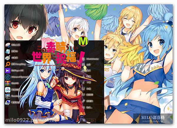《 為美好的世界獻上祝福 》 Konosuba God's Blessing Win10 佈景主題THEME11 この素晴らしい世界に祝福を 是曉夏目撰寫、三嶋黑音繪製插畫的日本輕小說作品 ~佐藤和真在某次意外中死亡 管理日本意外死亡青少年的水流女神阿克婭表示,某個異世界正受到魔王軍肆虐、人口大量減少,假如願意轉生到該世界的話 ....................