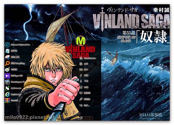 《 海盜戰記 》 Vinland Saga Win10 佈景主題THEME11 冰海戰記 作者幸村誠 ~中世紀的維京人號稱是地表最強的民族,他們以殘暴的手段攻擊歐陸,其中一位傳說中的戰士‧托爾茲的兒子托爾芬,從小在戰場上長大,跟著殺父仇人阿謝拉特不斷追求夢幻之地『Vinland!』....................