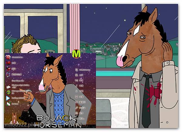 《 馬男波傑克 》 BoJack Horseman Win10 佈景主題THEME11 由拉斐爾·鮑伯-華克斯伯格創作 在Netflix開播的成人喜劇動畫 ~50多歲的過氣情境喜劇半人半馬男演員 在成名後,他迷失在好萊塢的鎂光燈之中 也在其中墜落 是個有知覺與洞察力的人 但因他內心的不安感,孤寂與絕望使他總有自毀傾向..........
